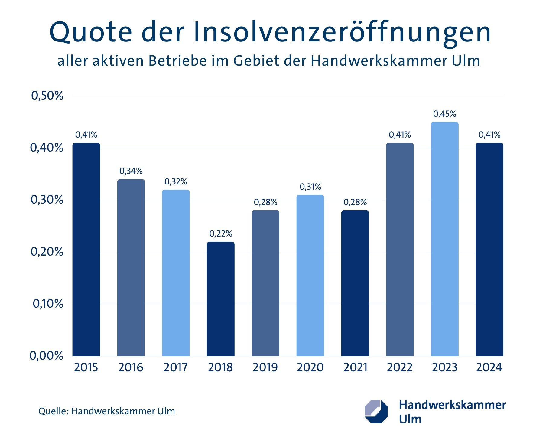 Trotz wirtschaftlicher Herausforderungen zeigt sich das Handwerk zwischen Ostalb und Bodensee robust: Die Zahl der Insolvenzen im Bereich der Handwerkskammer Ulm ist 2024 leicht gesunken – von 99 (2023) auf 92 Betriebe. Die Insolvenzquote liegt bei 0,41 Prozent (2023: 0,45 Prozent) und bleibt damit auf einem niedrigen Niveau.