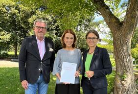 : Dr. Stefan Wolf, Präsident Arbeitgeberverband Gesamtmetall und Co-Vorsitzender des Aufsichtsrats mit Petra Olschowski MdL, Ministerin für Wissenschaft, Forschung und Kunst des Landes Baden-Württemberg und Vorsitzende des Aufsichtsrats, nach der Überreichung der Nachhaltigkeitsstrategie durch Präsidentin Prof. Dr. Martina Klärle (rechts). Bildrechte: DHBW Präsidium