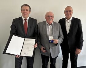 Verwaltungsratsvorsitzender Peter Polta (links) und Dieter Steck (rechts), Vorstandsvorsitzender der Kreissparkasse Heidenheim, überreichen Rudi Neidlein die Baden-Württembergische Sparkassenmedaille. Foto: Kreissparkasse Heidenheim