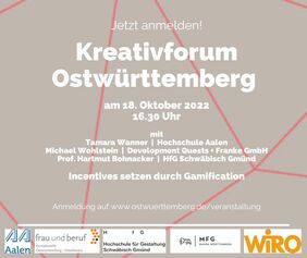 Im zweiten virtuellen Kreativforum Ostwürttemberg konnten sich am Dienstag, 18. Oktober 2022, interessierte Teilnehmende über die Möglichkeiten, Problemstellungen aber auch Weiterbildungsformate der Gamification-Ansätze aus der Kultur- und Kreativszene informieren.