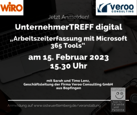 Die WiRO lädt ein zum UnternehmerTreff digital am 15. Februar 2023 um 15.30 Uhr. Hier werden Sarah und Timo Lenz, Geschäftsleitung der Firma Veroo Consulting GmbH aus Bopfingen, einen Impuls zur prägnanten Thematik der gesetzlichen Arbeitszeitenerfassung, die seit September 2022 für Unternehmen zur Pflicht wird, geben und Einblicke und Möglichkeiten auf Basis bestehender Microsoft 365 Lizenzen aufzeigen. Auch die Thematik der Abwesenheitsverwaltung sowie agile Formen der digitalen Zusammenarbeit stehen im Fokus. Im Anschluss stehen die Experten gerne für einen persönlichen Austausch zur Verfügung.