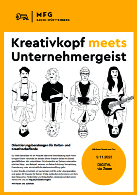 In Kooperation mit der WiRO bietet die MFG Baden-Württemberg persönliche und kostenfreie Orientierungsberatungen für Kultur- und Kreativschaffende in Baden-Württemberg. Der nächste Beratungstag findet am 09.11.2023 digital über Zoom statt.