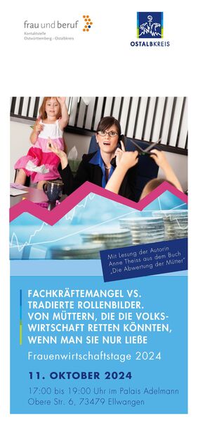 Am Freitag, 11. Oktober 2024 von 17 – 19 Uhr findet im Palais Adelmann in Ellwangen eine hochaktuelle Veranstaltung im Rahmen der Frauenwirtschaftstage 2024 statt. Unter dem Titel "Fachkräftemangel vs. tradierte Rollenbilder – Von Müttern, die die Volkswirtschaft retten könnten, wenn man sie nur ließe" liegt der Fokus auf der oft übersehenen Rolle von Müttern als ungenutztes Fachkräftepotenzial.