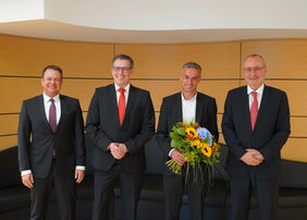 Bildunterschrift (von rechts): Der Vorstandsvorsitzende Dieter Steck, das gewählte stellvertretende Vorstandsmitglied Fabio La Rossa, der Verwaltungsratsvorsitzende Peter Polta und der stellvertretende Vorstandsvorsitzende Thomas Schöpplein. Foto: Kreissparkasse Heidenheim
