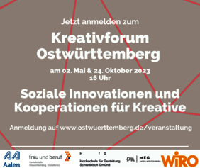 Die Wirtschaftsförderungsgesellschaft mbH Region Ostwürttemberg (WiRO), die Kontaktstelle Frau und Beruf Ostwürttemberg – Ostalbkreis, die Hochschule für Gestaltung Schwäbisch Gmünd und die Wirtschaftsförderung der Stadt Aalen laden alle Akteur*innen der Kultur- und Kreativbranche, regionale Unternehmen aus Industrie und Handwerk, Studierende, Start-ups sowie interessierte Bürger*innen herzlich ein, sich im diesjährigen Kreativforum aktiv über das Thema Genossenschaften auszutauschen, sich mit Expert*innen zu vernetzen und im Rahmen von Impulsvorträgen aktuelle Forschungsansätze, Beispiele guter Praxis und erfolgreiche Kollaborationen kennenzulernen. Die zweiteilige Veranstaltungsreihe wird von der MFG Medien- und Filmgesellschaft Baden-Württemberg unterstützt.