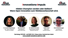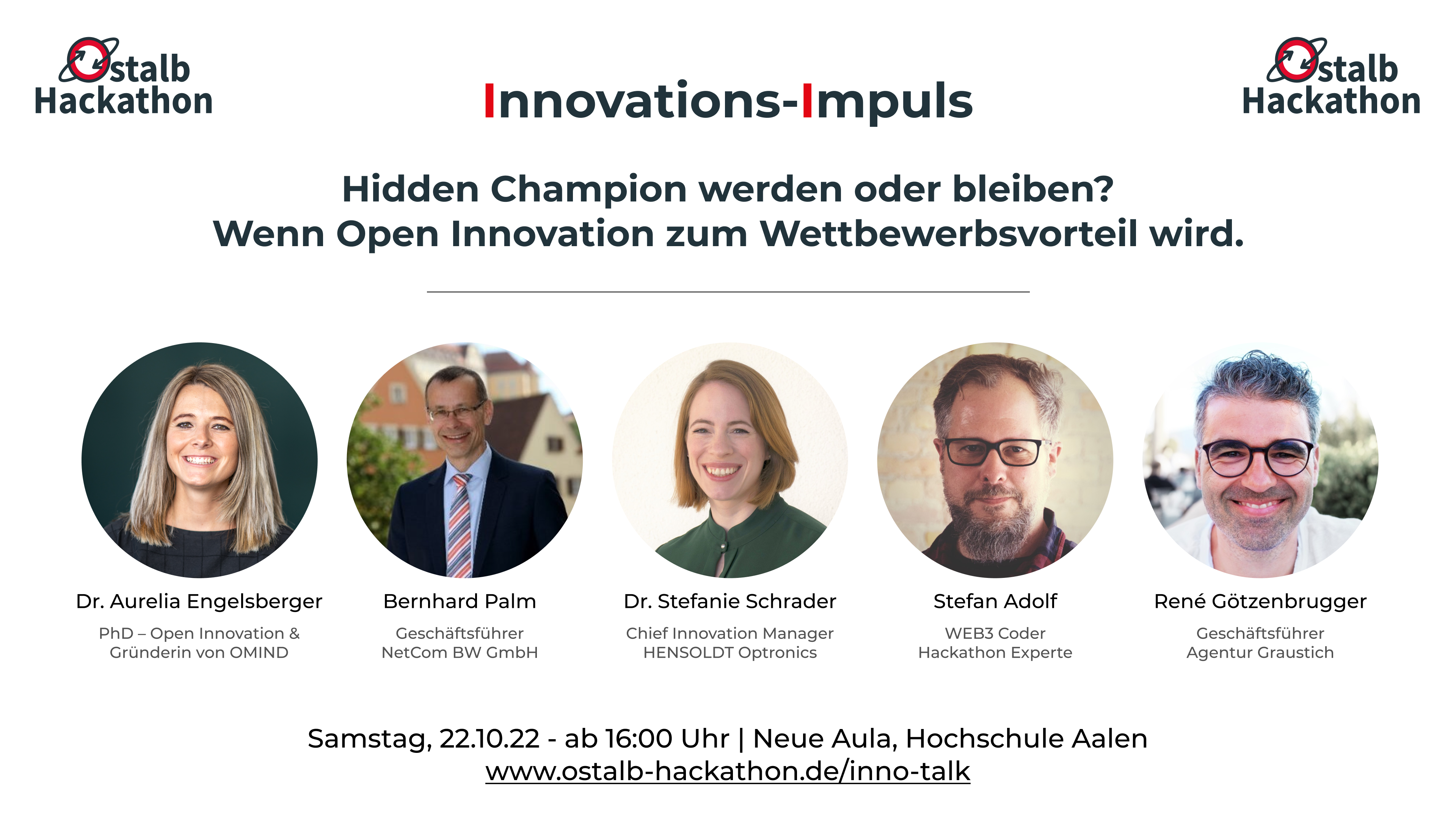 Unternehmerinnen und Unternehmer sind zudem am 22. Oktober 2022 ab 16:00 Uhr herzlichst zum Ostalb Hackathon eingeladen, um unter dem Motto „Hidden Champion werden oder bleiben? Wenn Open Innovation zum Wettbewerbsvorteil wird“ die Potenziale von Open Innovation zu diskutieren und direkt vor Ort zu erleben. Die Teilnehmenden erwartet eine spannende Gesprächsrunde mit Expert*innen aus der Wissenschaft und Wirtschaft sowie hochkarätigen Vertretern aus der Region, ein Einblick in den Hackathon sowie weitere Austauschmöglichkeiten bei einem kleinen Snack und Getränken. Nachdem Samstag die wohlverdiente Familienzeit ist, ist zudem für eine Kinderbetreuung im Explorhino gesorgt.