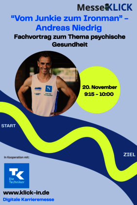 Ein Programmhöhepunkt ist der Vortrag „Vom Junkie zum Ironman“ von Triathlet und Mentalcoach Andreas Niedrig, der von 9:15 bis 10:00 Uhr live zugeschaltet wird. Er berichtet über seinen Lebensweg und die Bedeutung von Ausdauer und innerer Haltung.
