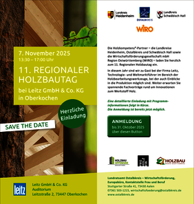 Die Holzkompetenz³-Partner – die Landkreise Heidenheim, Ostalbkreis und Schwäbisch Hall sowie die Wirtschaftsförderungsgesellschaft mbH Region Ostwürttemberg (WiRO) – laden Sie herzlich zum 11. Regionalen Holzbautag ein.