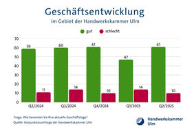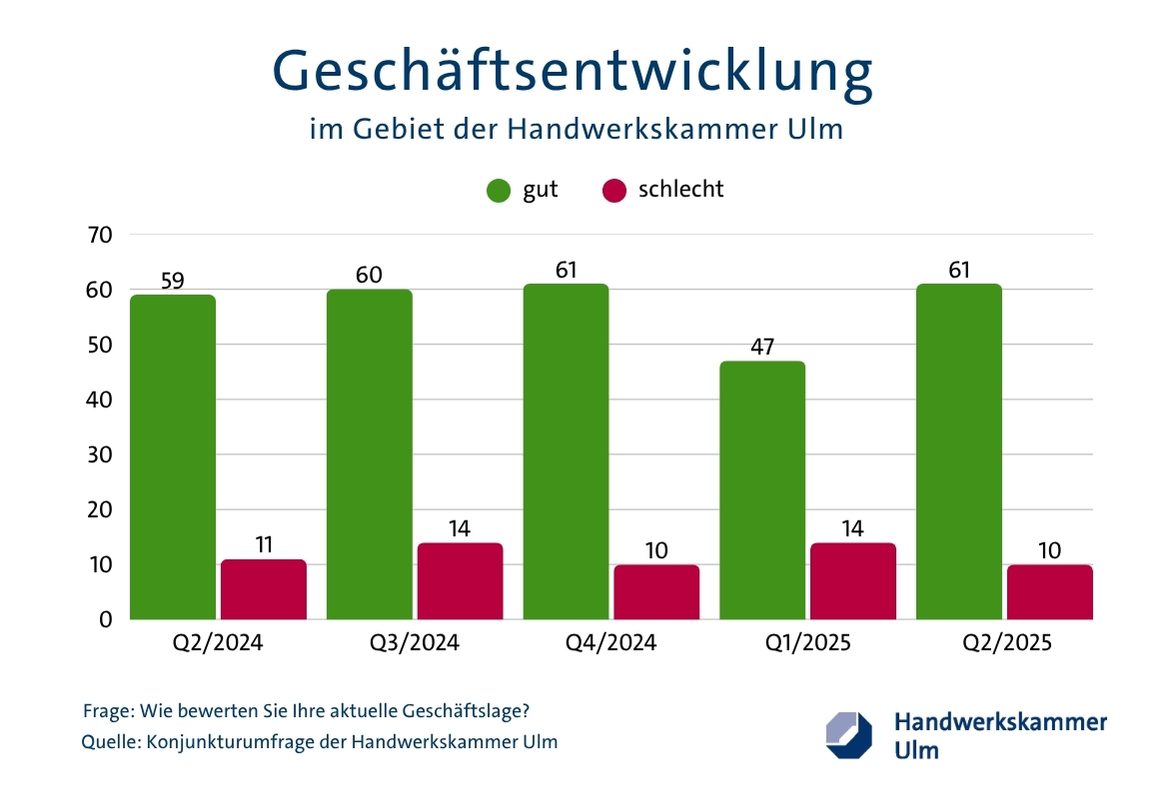 Die aktuelle Konjunkturumfrage der Handwerkskammer Ulm zeigt zur Jahresmitte 2025 eine verhalten positive Entwicklung im regionalen Handwerk. 61 Prozent der Betriebe zwischen Ostalb und Bodensee bewerten ihre Geschäftslage als gut – ein leichter Anstieg gegenüber dem Vorjahresquartal (59 Prozent). Besonders das Baugewerbe, Kfz-Handwerk und personenbezogene Dienstleistungen melden Aufwärtstendenzen.