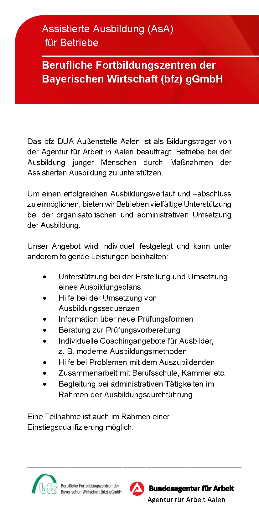 Weitere Informationen finden Sie unter Assistierte Ausbildung (AsA) | Bundesagentur für Arbeit.