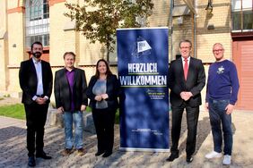 Bildunterschrift (v.l.n.r.): Daniel Schramm, Projektmanager des Welcome Center Ostwürttemberg am Standort Heidenheim, Steffen Kohnle, Leiter des Welcome Center Ostwürttemberg, WiRO-Geschäftsführerin Nadine Kaiser, Landrat Peter Polta, WiRO-Aufsichtsratsvorsitzender und Landrat des Landkreises Heidenheim, Michael Sünderhauf, Community-Mager im DOCK33. Bildquelle: Tobias Mayer