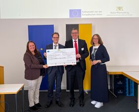 Ministerialdirektor Michael Kleiner überreicht dem WiRO-Aufsichtsratsvorsitzenden Landrat Peter Polta sowie der Wirtschaftsbeauftragten des Ostalbkreises Andrea Hahn und WiRO-Geschäftsführerin Nadine Kaiser den Zuwendungsbescheid für die Förderung des Projektes „Regionales Innovationssystem Ostwürttemberg“. Bildquelle: Ministerium für Wirtschaft, Arbeit und Tourismus Baden-Württemberg